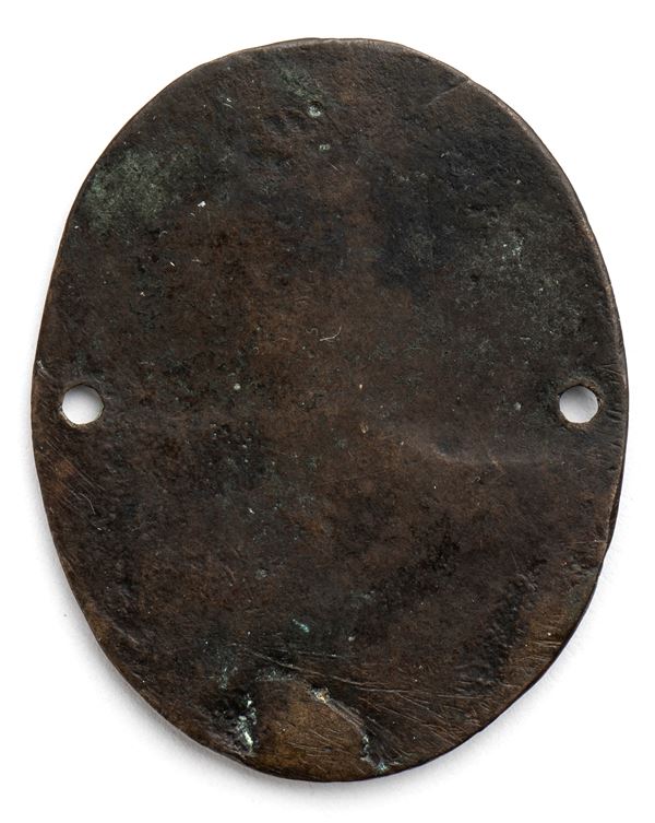 Oval bronze plaque, dark brown patina, two holes on the sides; 45.1 x 36.3 mm; 20.2 g.