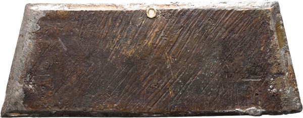Trapezoidal bronze plaque, light brown patina; 45 x 105 mm: 123 g.