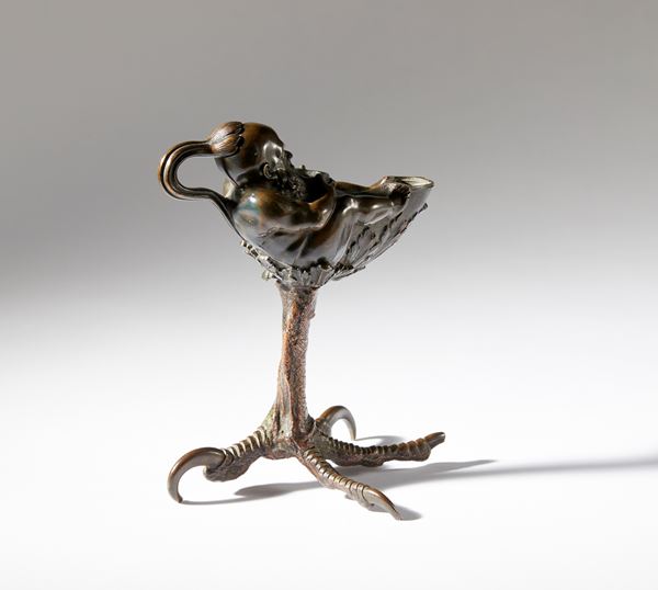 Aristotelianism did not disdain the observation of nature and this is the reason for the proliferation in the Padua area of many small bronzes in the shape of animals taken directly from life: crab-shaped inkwells, lamps as in our case supported by the legs of a bird of prey or compositions of coiled snakes fighting.