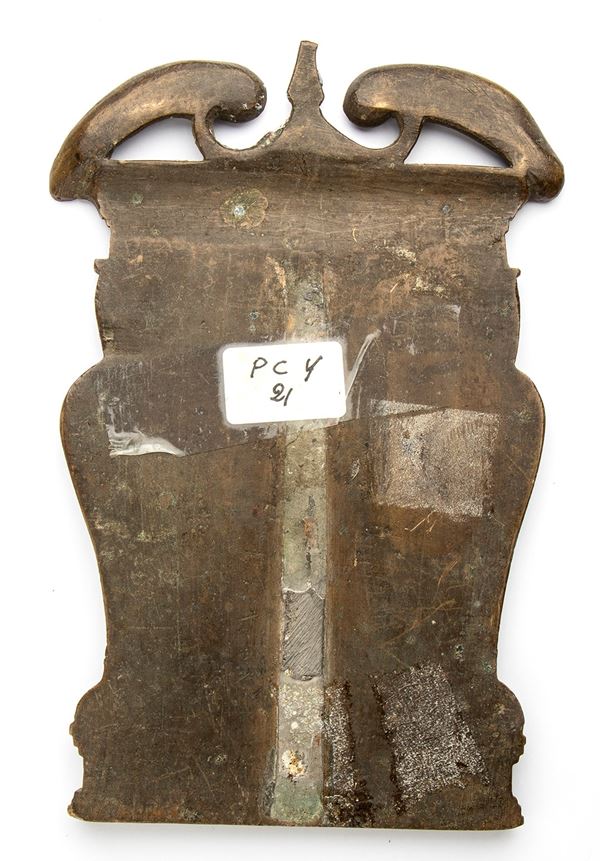 Bronze plaque mounted in Pace in the shape of a shrine; missing handle, missing in the center above the architrave, mm 146 x 97.30; gr 237.8.