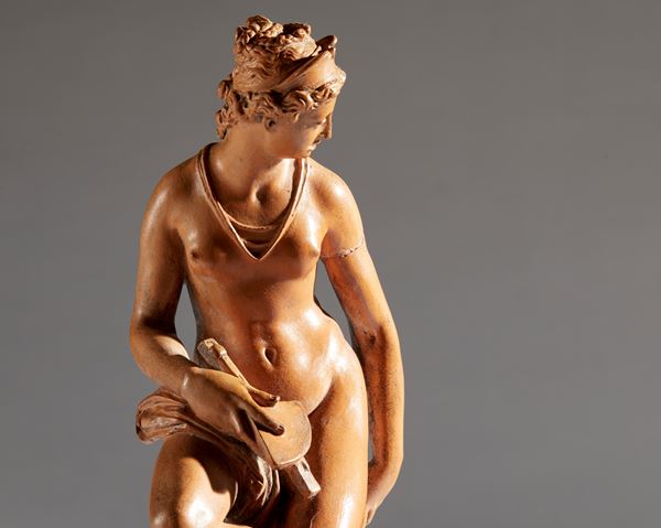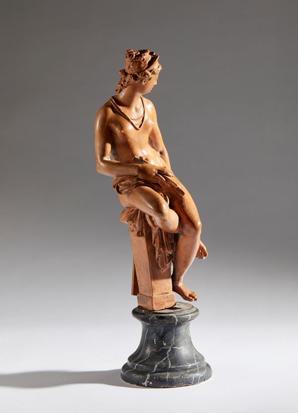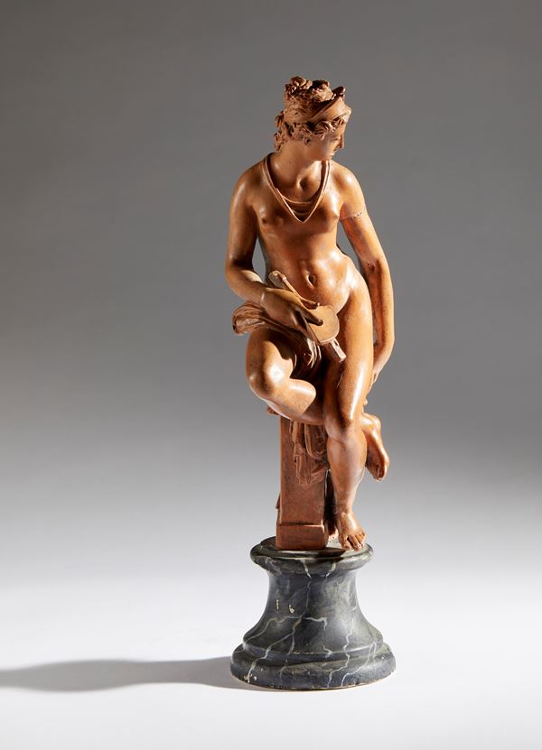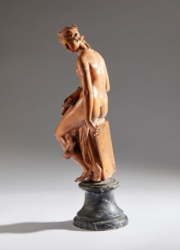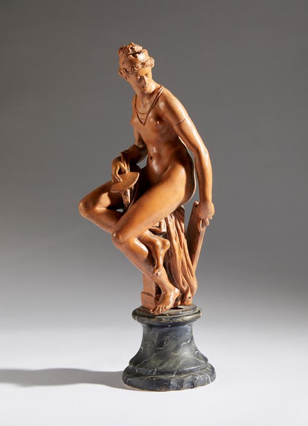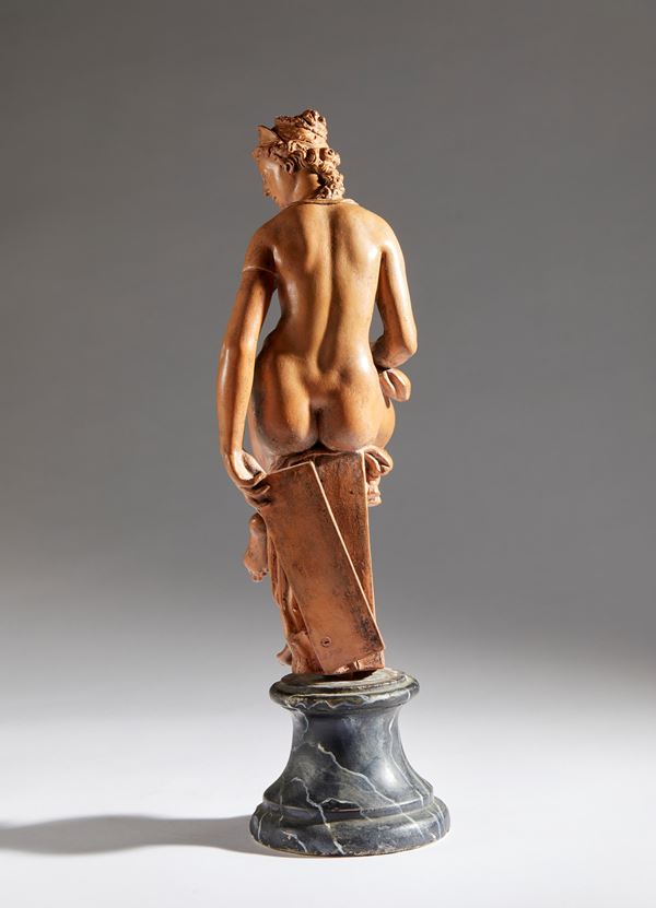 This interesting terracotta model is based on the marble sculpture now kept at the Museo Nazionale del Bargello. There are various bronze copies, the only one signed GIO BOLONGE, is the one in the Museum of Fine Art in Boston. This one shows a pendant around the neck representing the plumb line. In many other versions the plumb line is missing and it is not clear whether these are versions taken from a defective model. Ours is a terracotta version originally bronzed, presumably ancient, dating between the 18th and 19th centuries. Note the absence of the pendant.