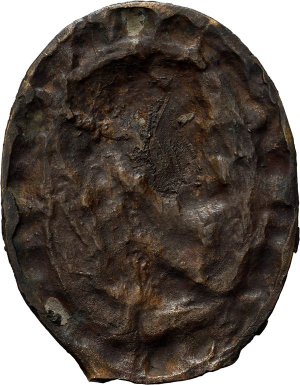 Oval bronze plaque, with brown patina, 107.5 x 83.4 mm.