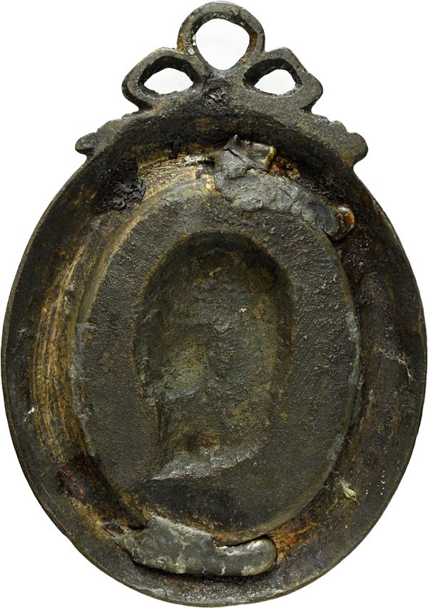 Oval bronze plaque, dark patina with traces of gilding; 73.2 x 65 mm (oval).