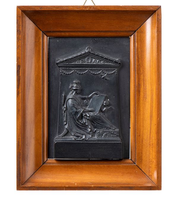 Rectangular bronze plaque with dark patina; 127 x 84 mm. With wooden frame.