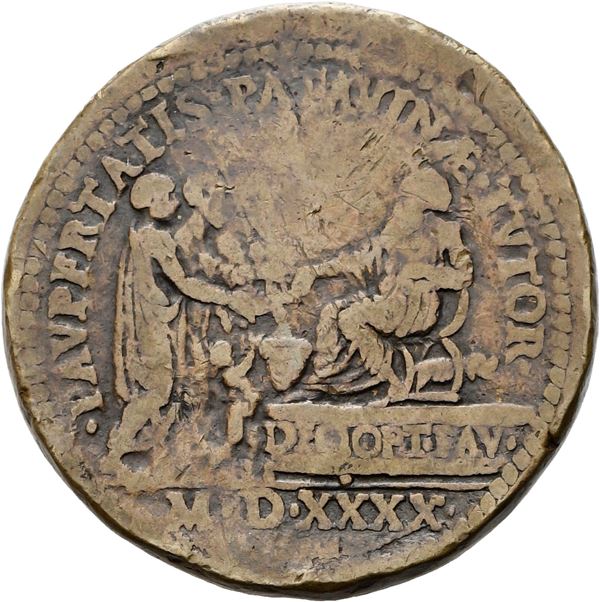 Ae mm. 36 HIER CORNELIVS Busto a d. con lunga barba R/ PAVPERITAS PATAVINAE TVTOR Corner seduto su podio mentre distribuisce cibo ai poveri. Es. MDXXXX Rif: Volt. 318; Kress 391