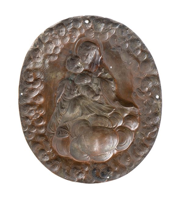 Oval plaque in embossed copper with reddish brown patina, four holes on the sides; 190.1 x 160.4 mm.