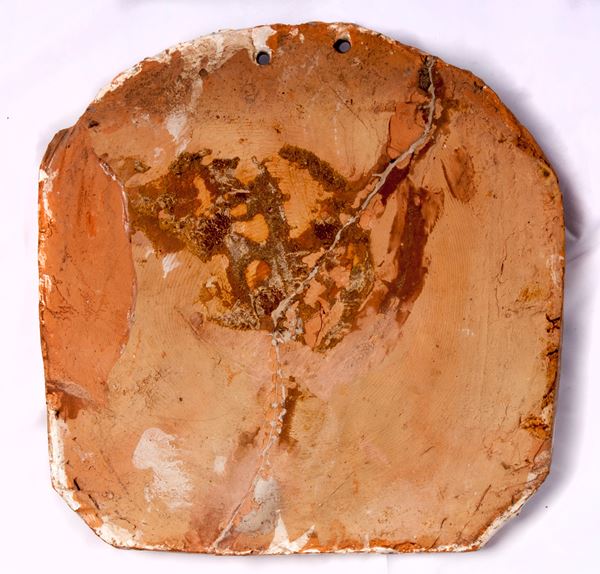State of conservation: it has a restored oblique vertical crack from firing, and small losses of enamel on the figures, breakage on the dove's beak.