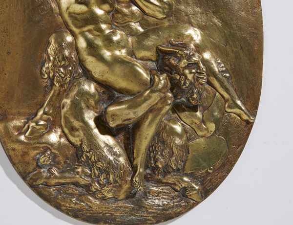 This very refined plaque depicts an erotic scene played by a Nymph and two satyrs. The female figure rides a satyr while the other embraces her. The naked woman holds in her hand a kind of scepter whose meaning is evident.