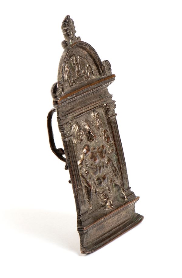 Pace-mounted bronze aedicule plaque, traces of ancient silver plating; 165 mm; 444 g.