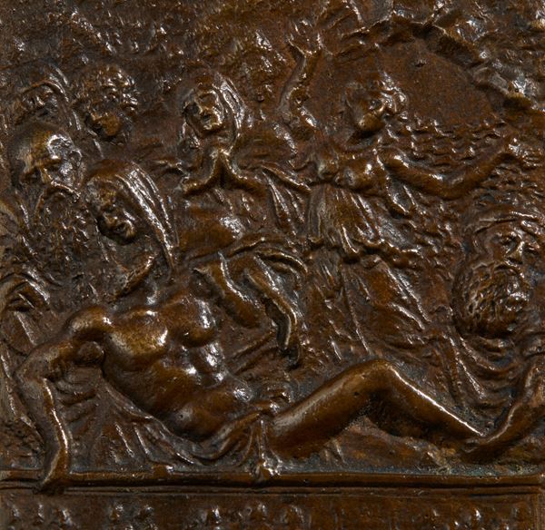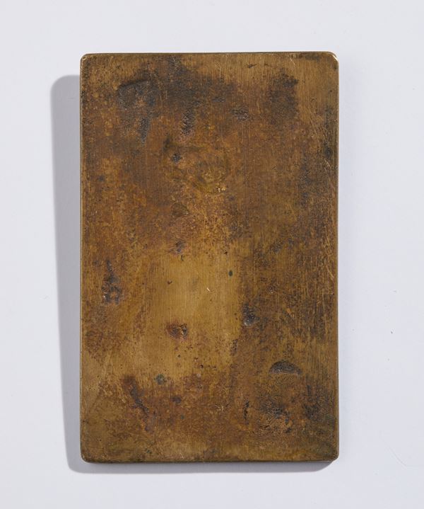 Rectangular bronze plaque with brown patina; 93 x 59 mm.
