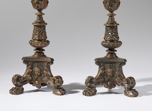 Splendid pair of bronze candlesticks decorated with Renaissance motifs. Tripod bases bearing angel heads on feral feet and acanthus leaf motifs.