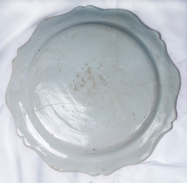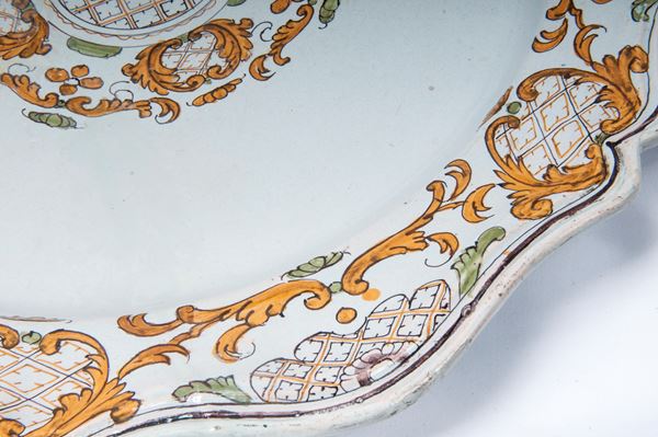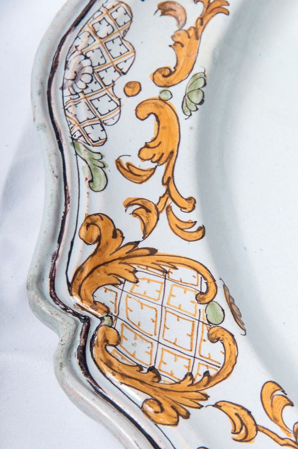 in polychrome ceramic with a six-pointed polylobed rim followed by a narrow brim and a full-field background. Back with smooth hillock. Decoration along the brim and in the center of the cord with rocailles, ramages and trellises in the colors rotten green, antimony yellow and manganese brown on a white and light green background.