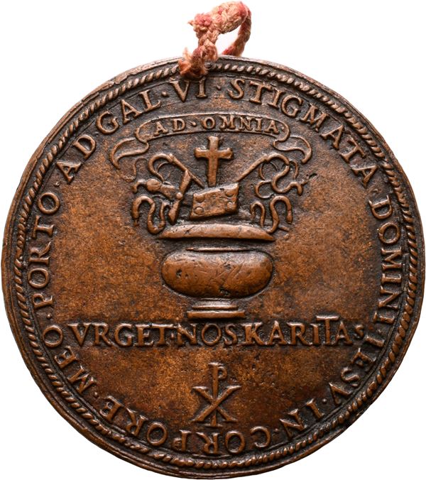 Medaglia in bronzo, patina marrone; mm 73,6; gr 124. Foro di sospensione e cordella dell'epoca.