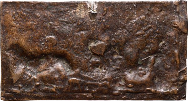 Rectangular bronze plaque, with brown patina; 68 x 129 mm; 144 g.