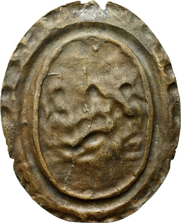 Oval bronze plaque with light brown patina; mm 117.9 x 87.6; gr 103.5.