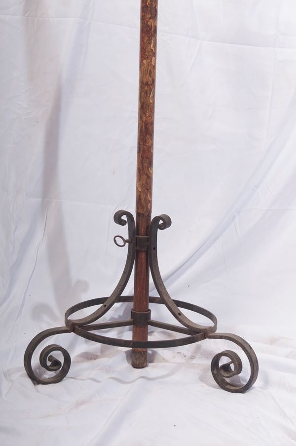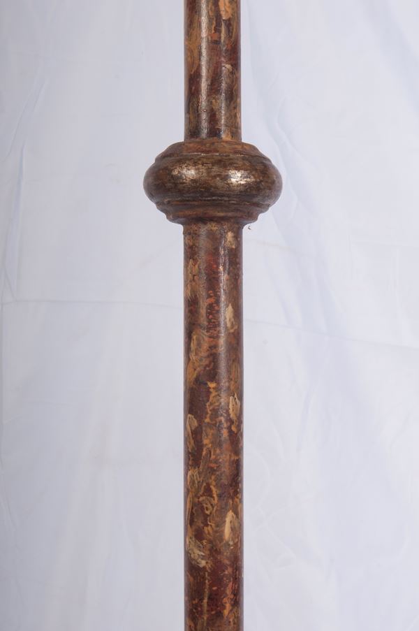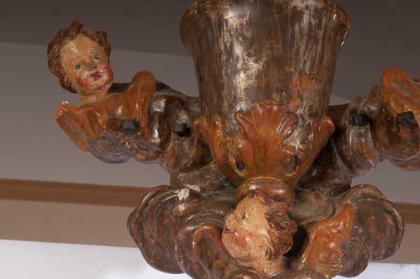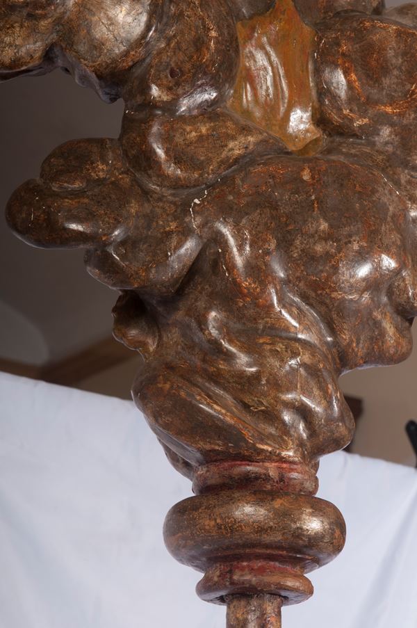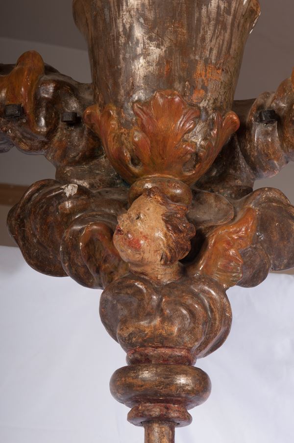 gold and silver. It is composed of three angel heads emerging from a cloudy body supporting a central silver bell that serves as a base for the candles. Sculpted and engraved parts. Supporting rod that is anchored to a three-foot iron base with volute supports.