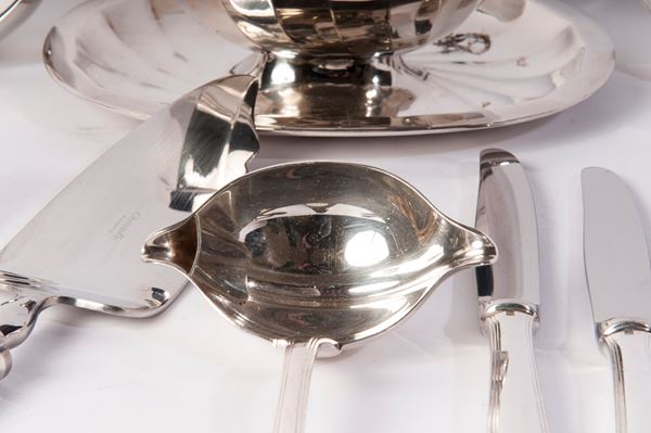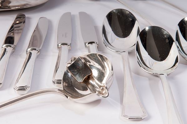 consisting of: pcs. 24 spoons, pcs. 24 forks, pcs. 24 knives, pcs. 24 teaspoons, pcs. 24 dessert forks, pcs. 24 dessert knives, pcs. 24 fish forks, pcs. 24 fish knives, pcs. 3 butter and cheese knives, a fish fork, a cake server, a ladle, a salad fork, a bread knife, a serving fork and spoon, a gravy boat and a gravy boat with ladle. pcs. 206