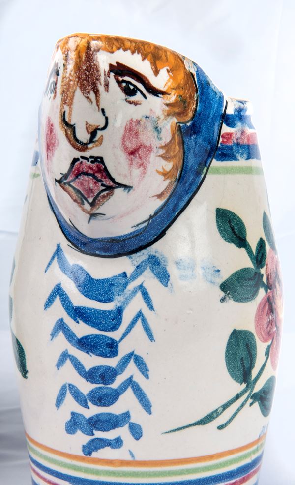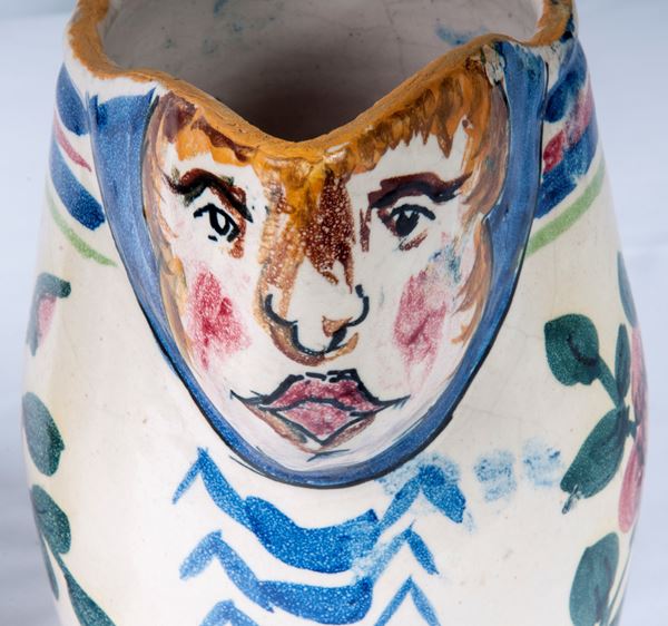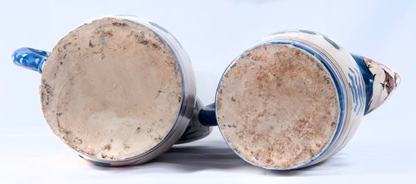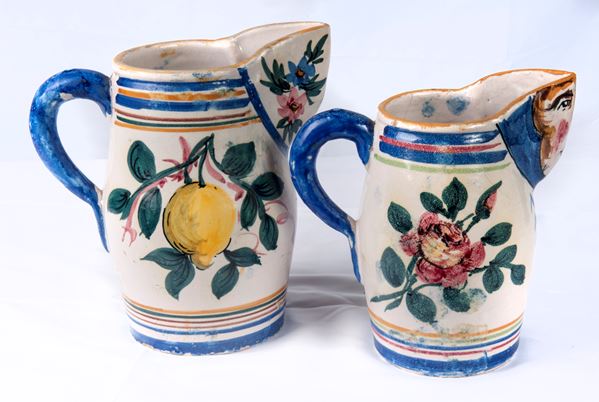 in polychrome ceramic with flower and fruit decoration on one and flowers and a cherub's head on the other. With a slightly barrel-shaped body with an ear-shaped grip. Spout-shaped pourer. Probably Vietri manufacture.
