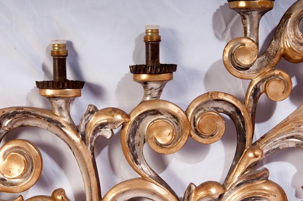 in gilded and silvered wood in Baroque style, composed of sculpted plant elements intertwined with each other.