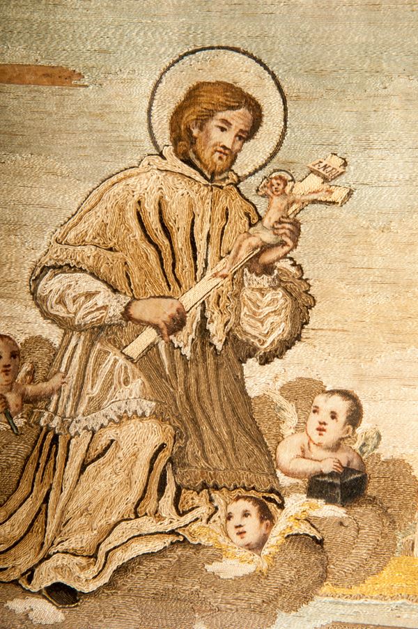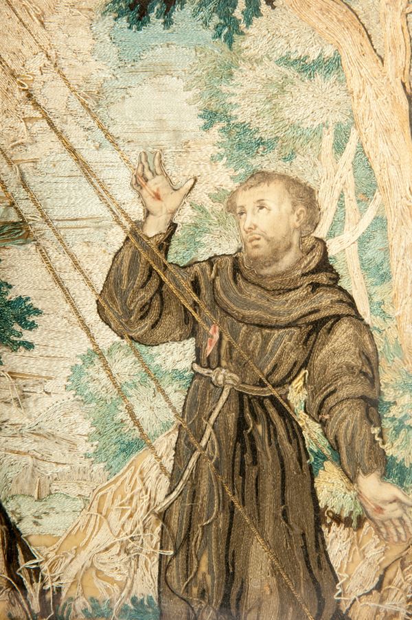 State of conservation: fair, it has raised areas in the weaving, the face and hands of St. Francis are made of painted paper.