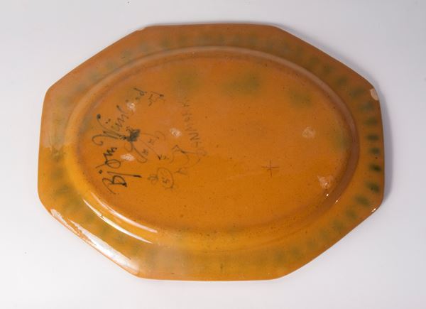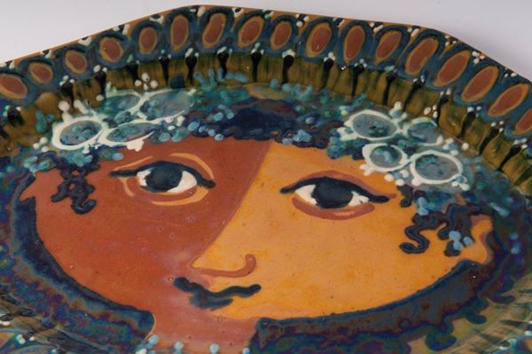 polychrome ceramic plate of octagonal shape with geometric decoration on the rim and a stylised face on the bottom. Signature of the author in brown under the glaze on the back