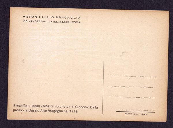 Futurist postcard. Lithograph, 105 x 150 mm. On the occasion of the Futurist exhibition of Giacomo Balla at the Casa d'Arte Bragaglia, via Condotti 21a, Rome.
