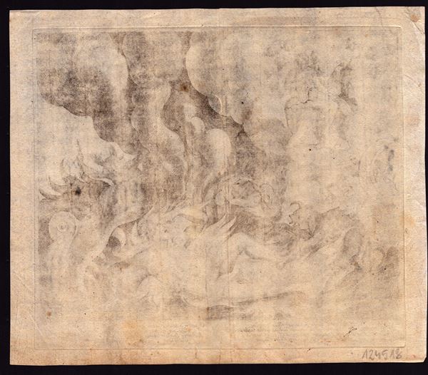 Very nice impression on thin laid paper with watermark (Moon). Sheet with traces of dirt and some creases.