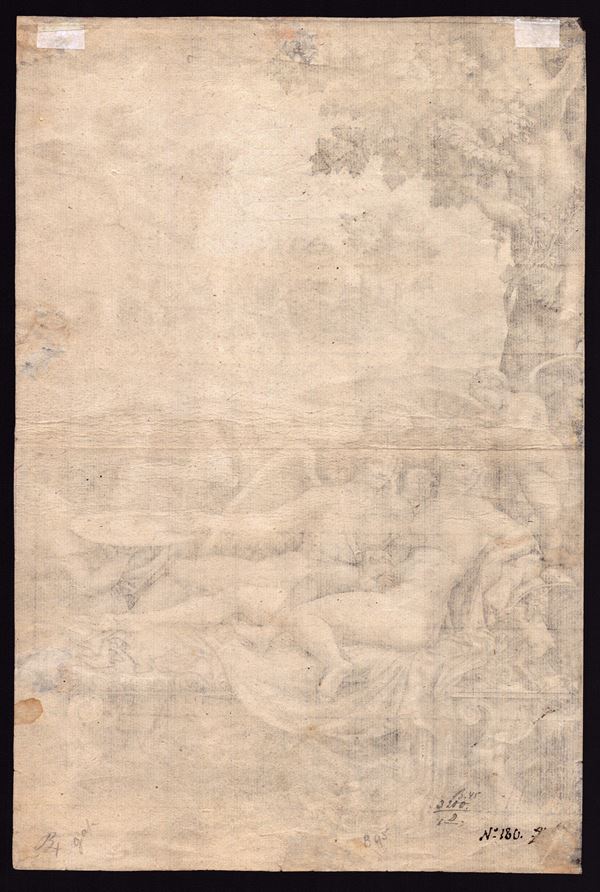 Very fine impression on thin laid paper with watermark (letter M and a star in the shield, Lewis 38, ca. 1580). Sheet in excellent condition, with thin margins, but unfortunately with the upper part missing of about 4 mm. On the verso, handwritten number of an ancient inventory.