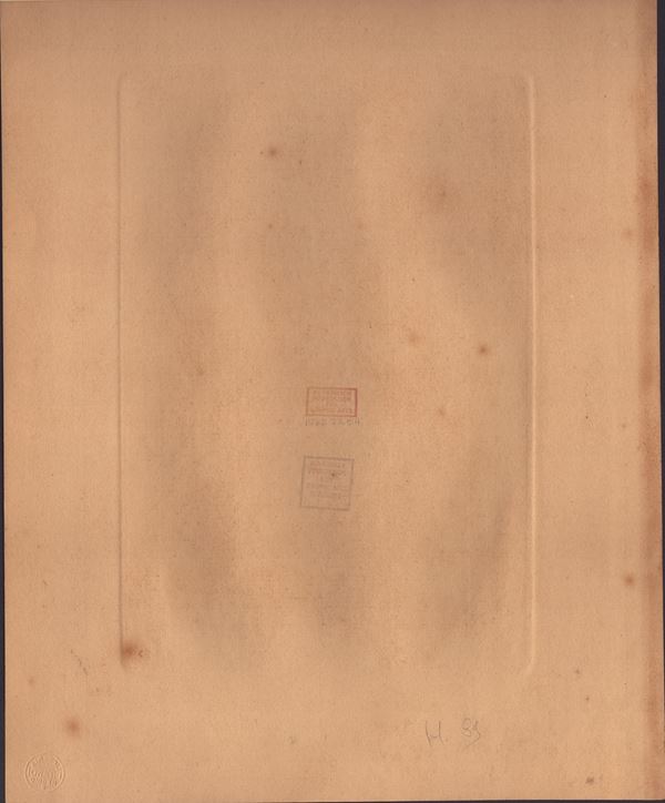Very fine, fresh impression on modern laid paper. Double collector's mark of the Achenbach Foundation for Graphic Arts on the back (Lugt 3a and 5069). Uniformly browned sheet, with a small stain on the lower right of the plate edge and stains on the margins. Blind stamp of the Libreria Prandi di Reggio on the lower right. Upper corners missing. Applied along the upper margin to the modern passe-partout.