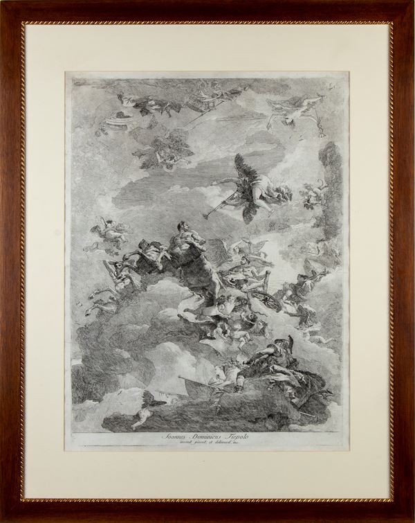 Very nice impression on laid paper with double watermark (double crown and sword with hand and double circle surmounted by crown). In very good condition. With walnut frame (97 x 77 x 2 cm). The print has not been examined outside the frame.
