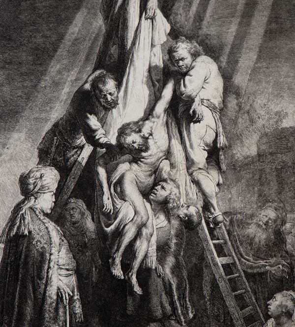 Superb, rich impression with strong contrasts, printed on laid paper. Trimmed to the platemark and missing the lower part. Reinforced paper, trace of restored central horizontal fold and some other very well executed restorations, but overall very good condition. With walnut frame (77 x 65 x 2 cm).
