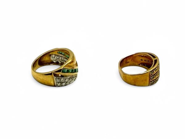 18k yellow gold, one ring set with 18 brilliant cut diamonds, approx. 0.30 ct , H-I, VS-SI and 11 rectangular emeralds, approx. 0.50 ct; the other ring set with 28 huit-huit diamonI-J, VS-VS and 2 square blue sapphre, approx. 0.25 ct.