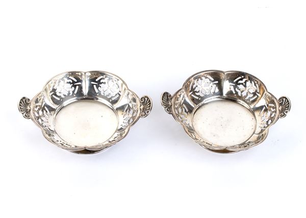 Round shaped, with shaped and openwork edges, and two small shell-shaped handles; resting on a circular base.