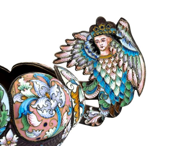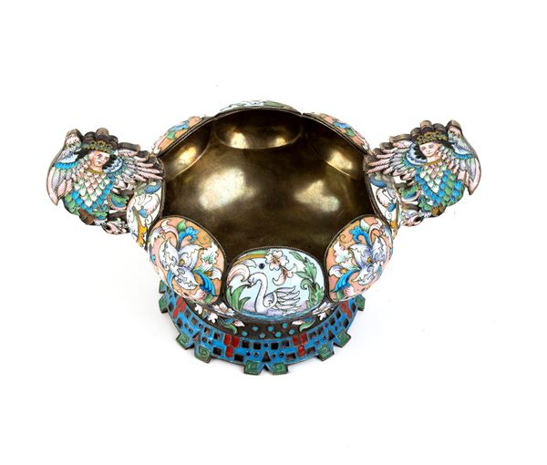 Resting on a round base with squared feet, embossed with stylised foliage and geometric elements on a blue ground; upper part lobed and enamelled with floral volutes of various colours and swans on a pale pink and blue ground within cord-worked borders, set at the sides with two Sirin-shaped openwork handles.