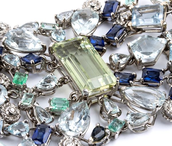 18k white gold, floral motif band set with different shape and cut coloured stones (aquemarine, eliodor, sapphires, emeralds, diamonds).
