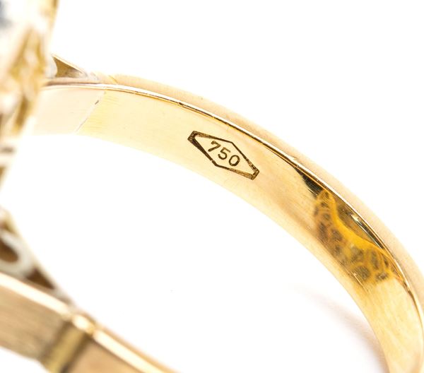 18k yellow gold and silver, set with blue topaz framed by huit-huit cut, rose cut and brilliant cut diamonds approx. 1.15 ct tot, H-K, SI.