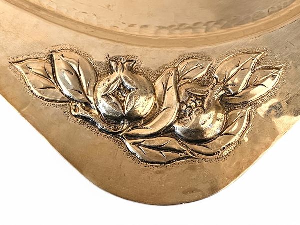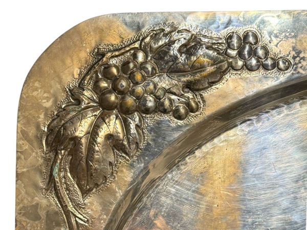 of rectangular shape with rounded corners, decorated on the corners with fruit and leaf motifs typical of the maker.
