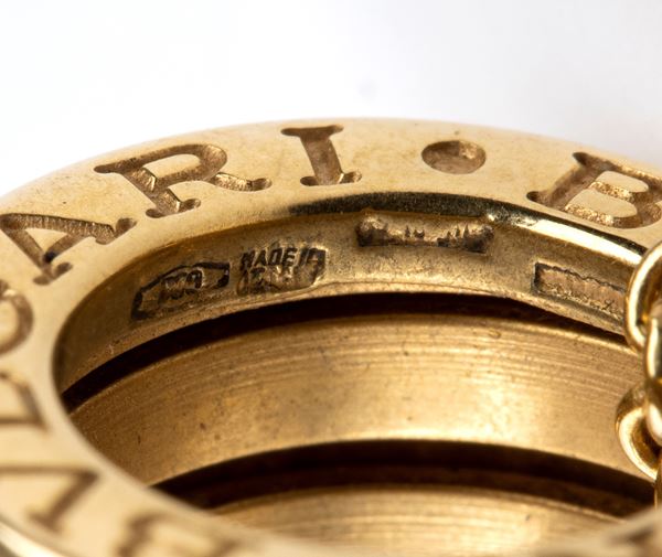 18k yellow gold cable link chain from which a ring pendant is suspended. Signed BVLGARI.