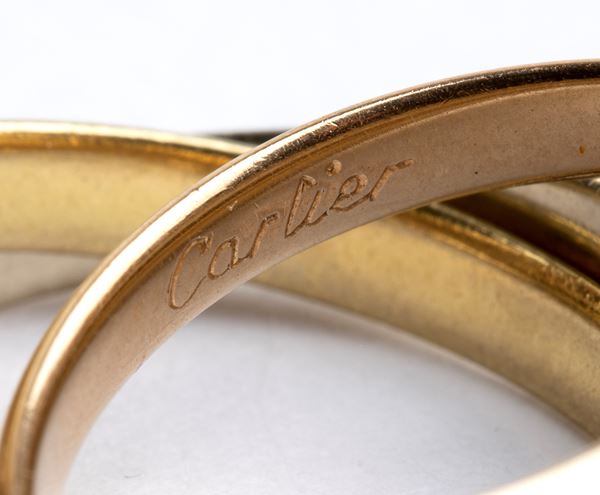 three band rings in yellow, rose and white 18k gold. Signed βCARTIERβ.
