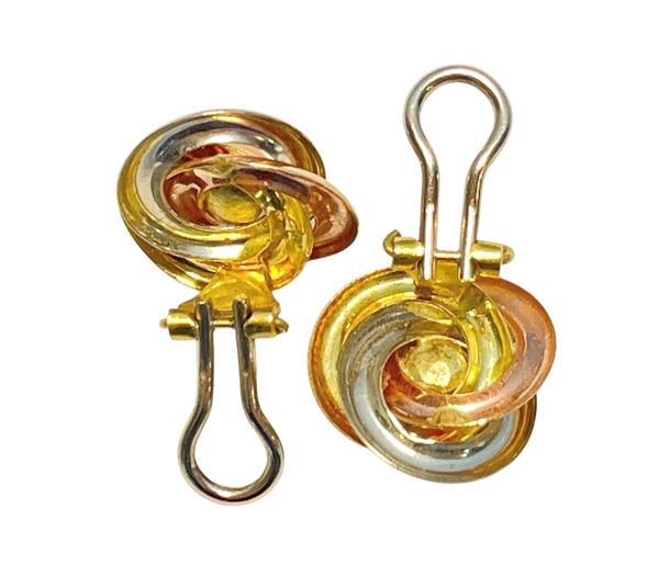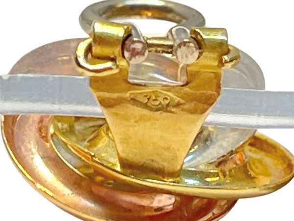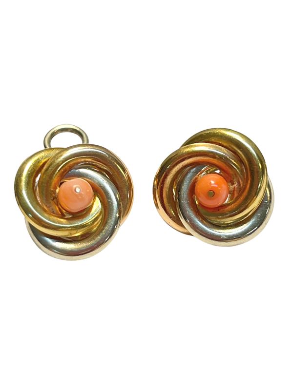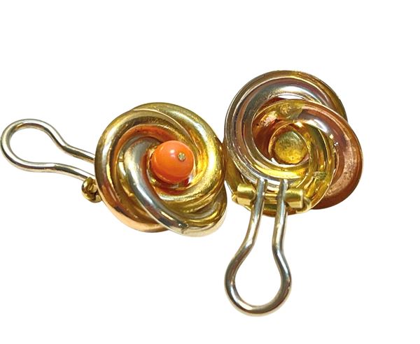 with a pinwheel motif in three colours of 18k gold, with a small Cerasuolo coral bead (Corallium Elatius).