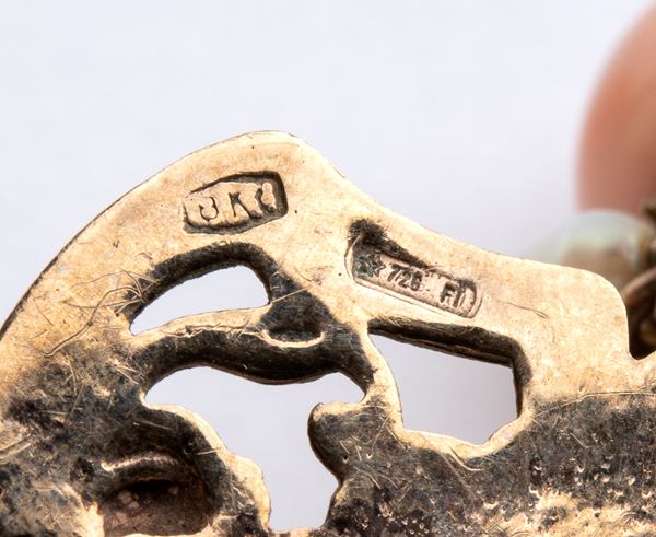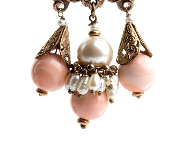 8k yellow gold, openwork ribbon motif, with cultured pearls and Cerasuolo coral beads fringe (Corallium Elatius).