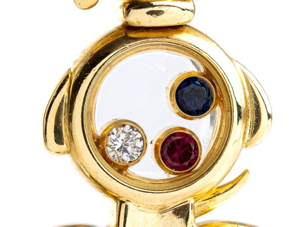 this adorable pendant from the Happy Diamond collection is crafted in 18k yellow gold in the shape Snoopy and accented with floating bezel-set diamond, ruby and sapphire inside the Snoopy belly in a clear crystal Chopard-inscribed case.