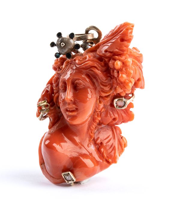 in low fineness gold, embellished with No. 02 huit-huit-cut and rose-cut diamonds, with a Cerasuolo coral (Coralliun Eliatus) in the center, radiating a half-length figure caught in a three-quarter-length pose, with mouth half-closed and eyes lost upward, and with hairstyle adorned with bunches of grapes and vines.