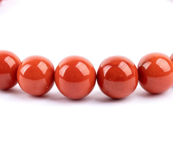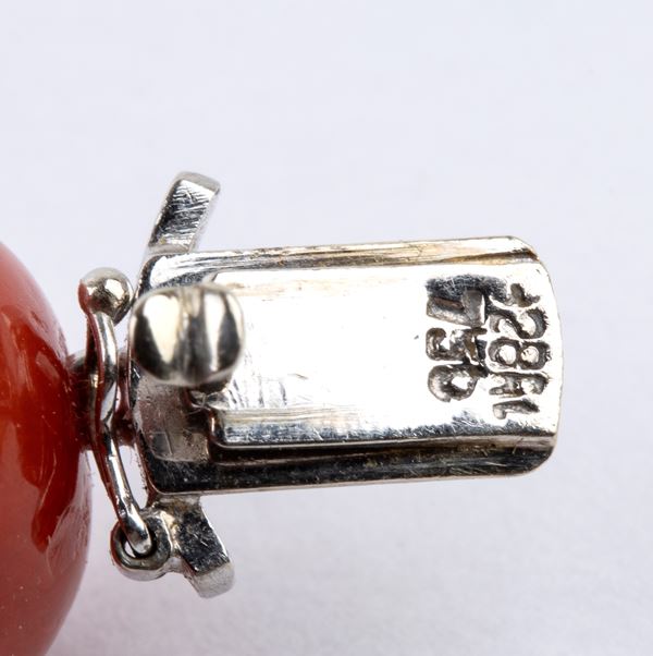 one strand of Mediterranean coral beads (Corallium Rubrun), 18k white gold clasp, decorated with small diamonds.