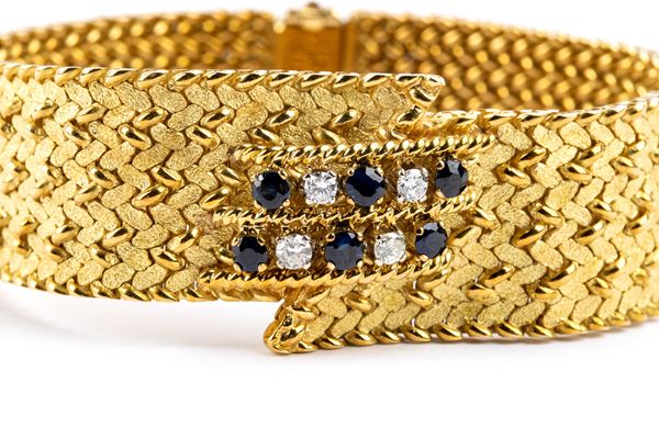 18k yellow gold, interlaced ribbon motif, sapphires and diamonds central detail.