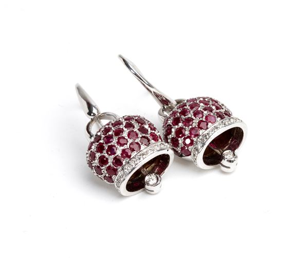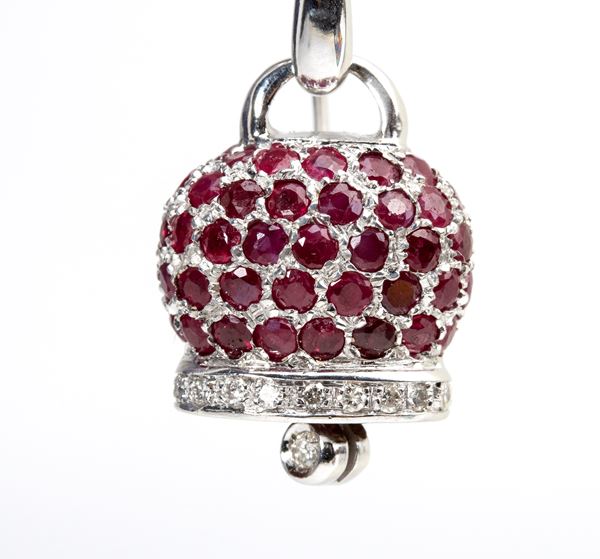 white gold, in the shape of a bell, embellished with pavรฉ set rubies and diamond details.
