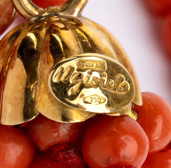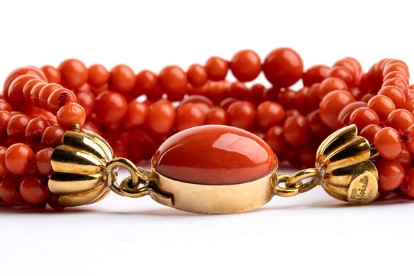 18K yellow gold clasp, with 8 strands of graduated Mediterrnean beads (CoralliumRubrum). Signed IL GIOIELLO.