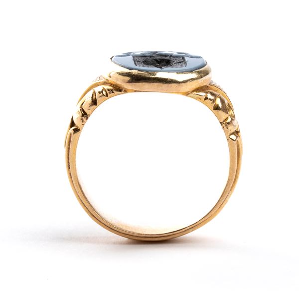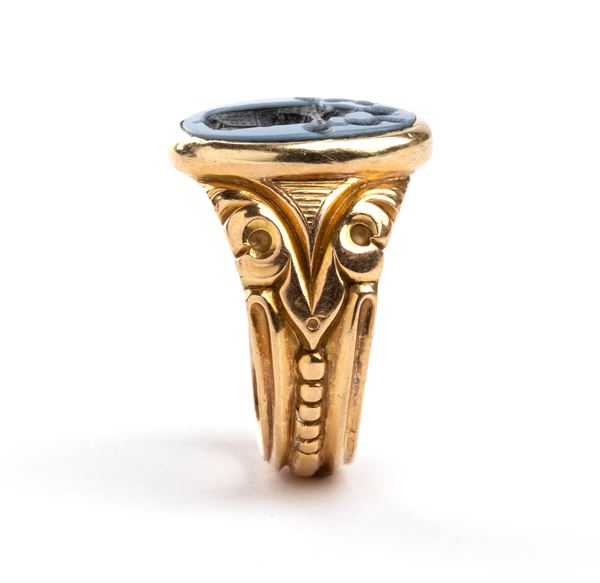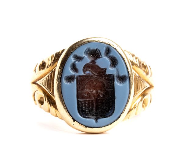 yellow gold decorated with stylized floral motives, set with an engraved agate depicting a coat of arms.
