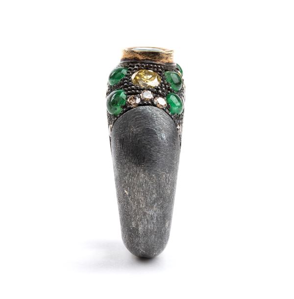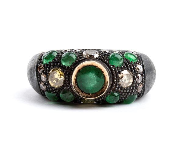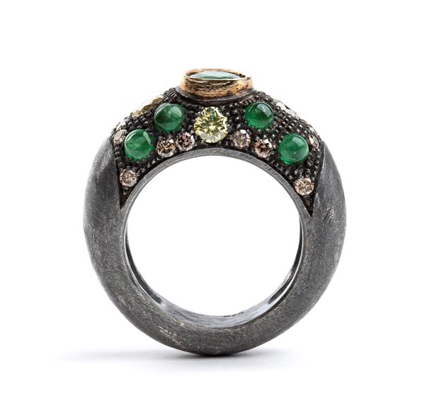 silver band ring set with fancy color diamonds and emeralds.