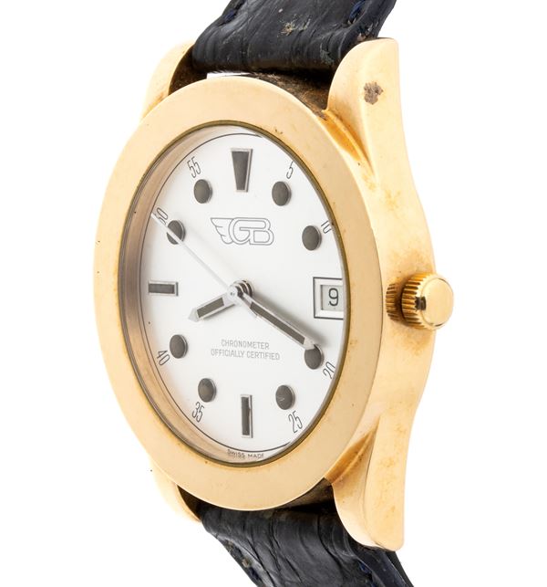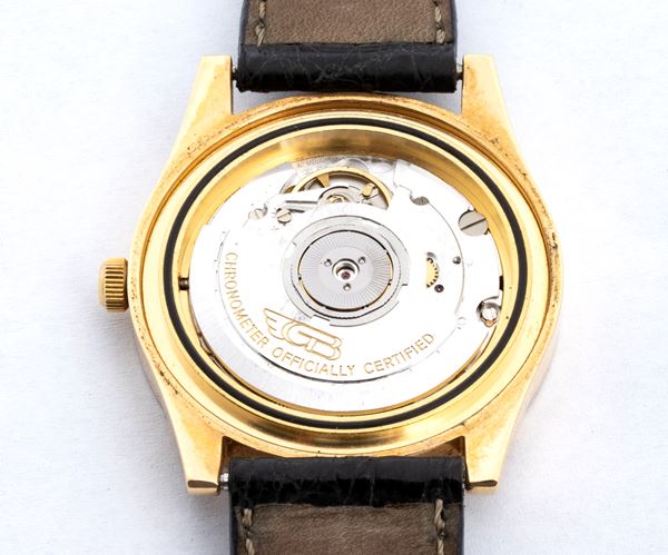 18k yellow gold case, white dial with spherical markers, center second and date at 3 o'clock, ETA 2892 basic mechanical self-winding movement.